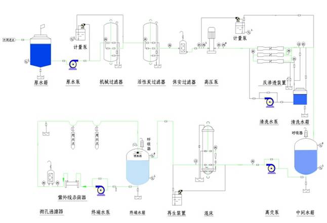 ☆自來水----水泵----多介質(zhì)過濾器----活性炭過濾器----自動(dòng)加藥裝置----保安過濾器----高壓泵----一級反滲透----中間水箱----中間水泵----紫外線殺菌器----EDI電去離子裝置或混床----純水箱----純水泵----清洗機(jī)
